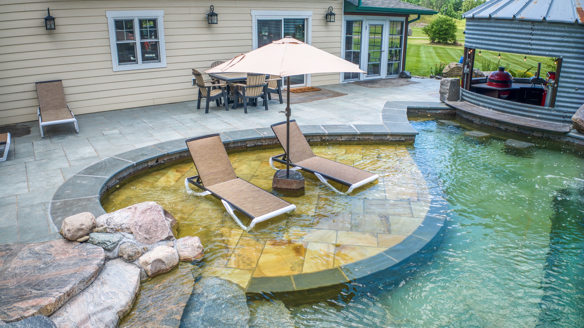 Blends into the landscape with organic shapes, stone edging, and lush vegetation.