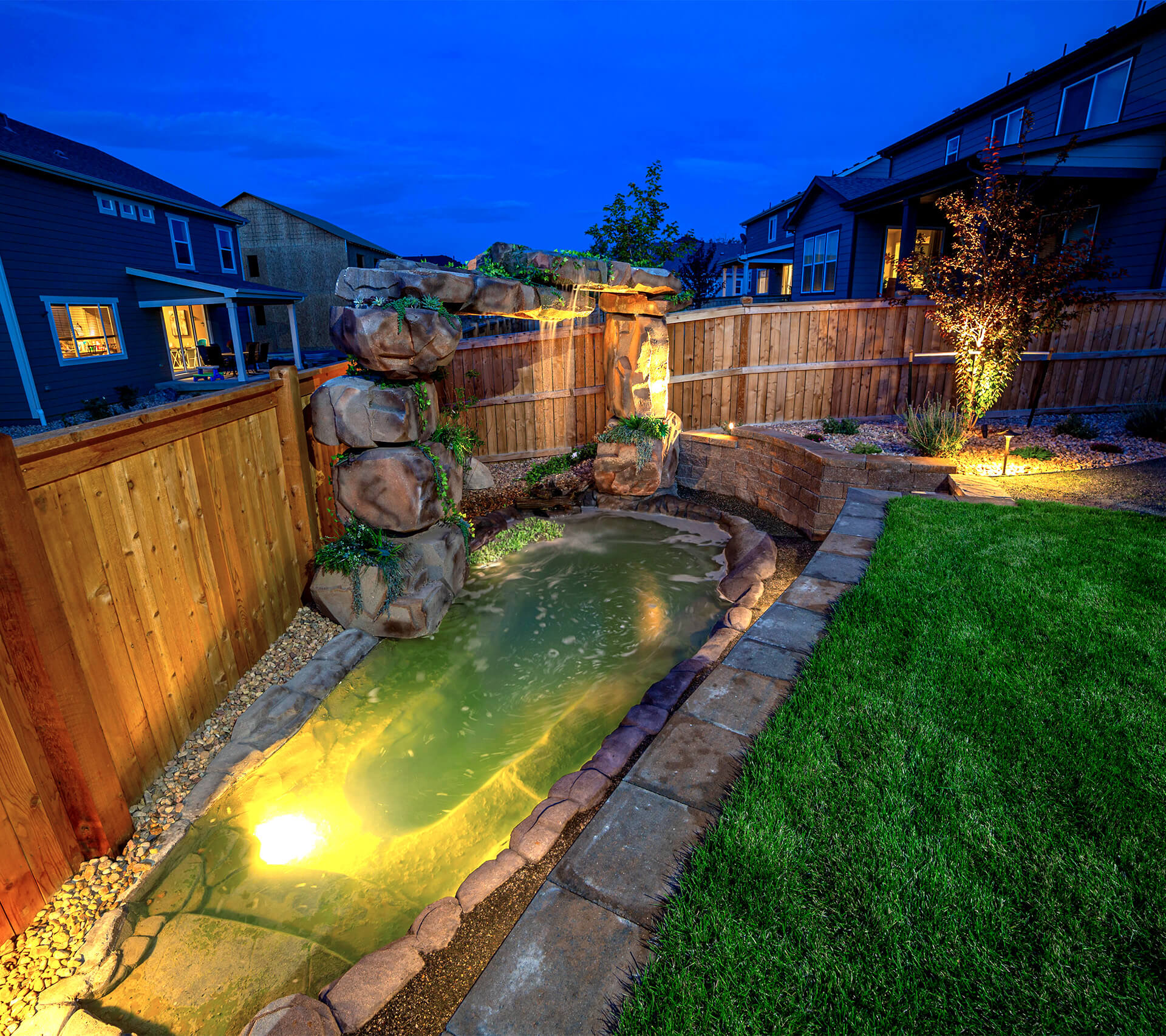 We take your vision of a perfect backyard water feature, and bring that design to life with a 3D rendering of what your pond or water garden will look like before we begin any construction. Whether you want a waterfall for your existing koi pond, or need to start from scratch, we can build your own backyard pond, complete with visually stunning landscape and underwater lighting! Also, if you haven’t had much luck finding a pool contractor recently, message us and we’ll help you get started with a recreational pond for swimming and entertaining the family.
