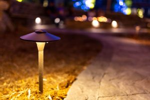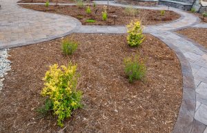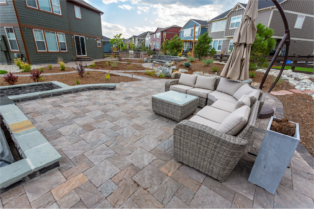 Walkways and patio areas laid in elegant pavers, gently guided by integrated landscape lighting