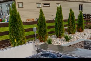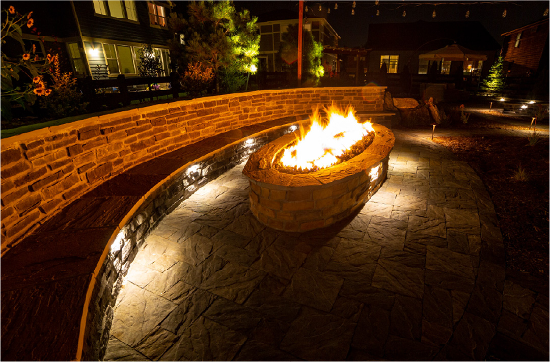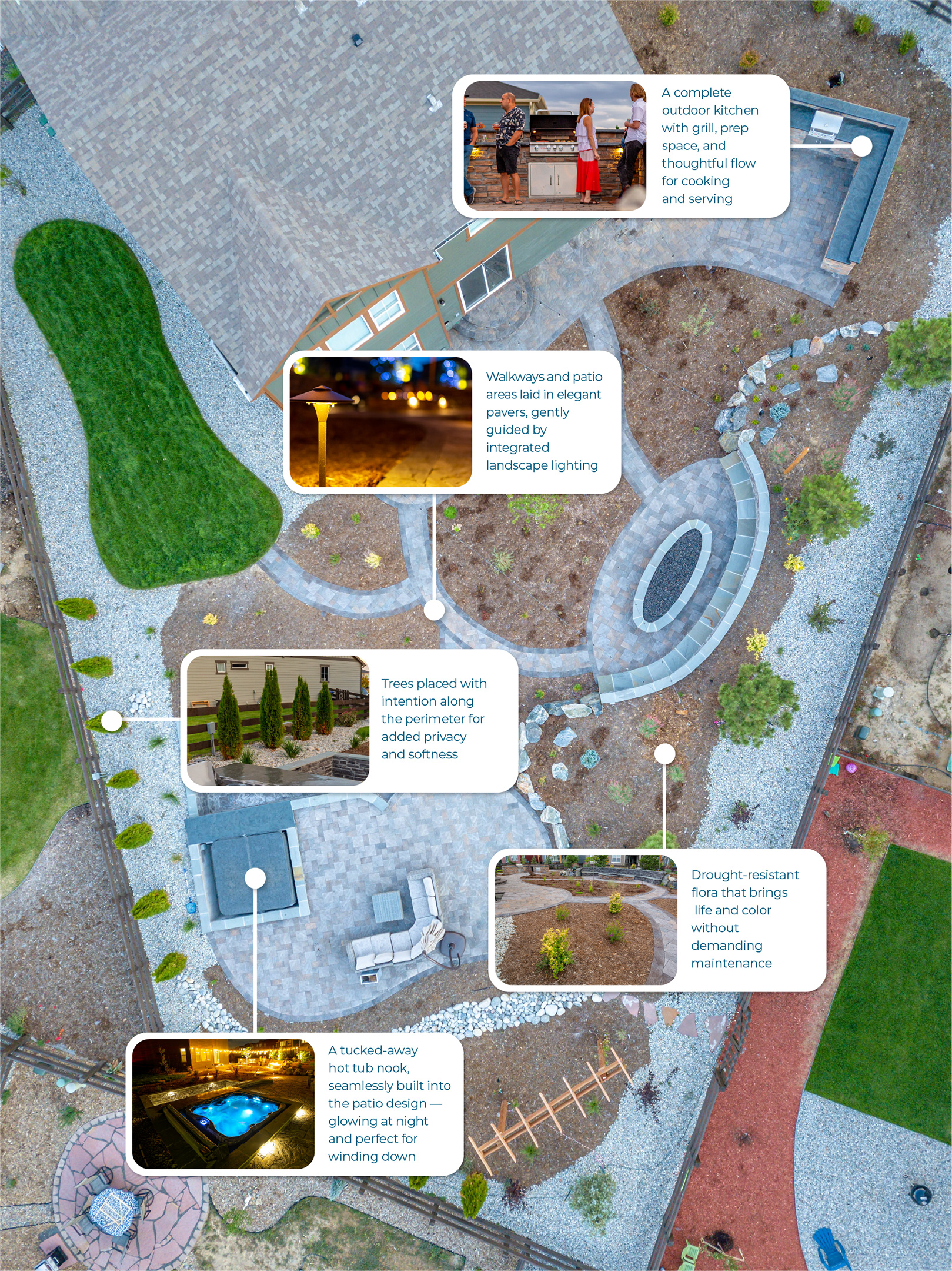 LANDSCAPE LIGHTING AND A COZY HOT TUB NOOK MAKE THIS OUTDOOR SPACE EXCITING AND ALIVE