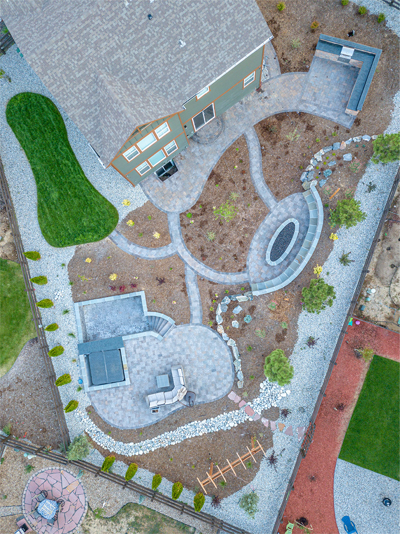 At the center of the space is a custom fire feature — grand in scale and half-ringed with a built-in seating wall that naturally draws people in. Surrounded by carefully chosen hardscaping, it sets the tone for a yard that's built to host.