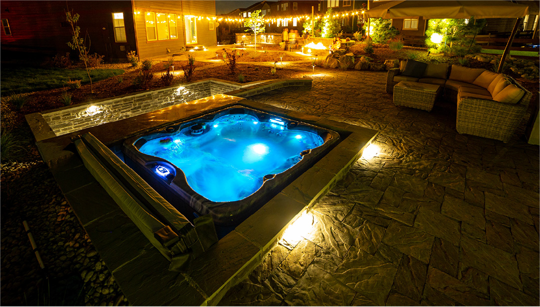 A tucked-away hot tub nook, seamlessly built into the patio design — glowing at night and perfect for winding down