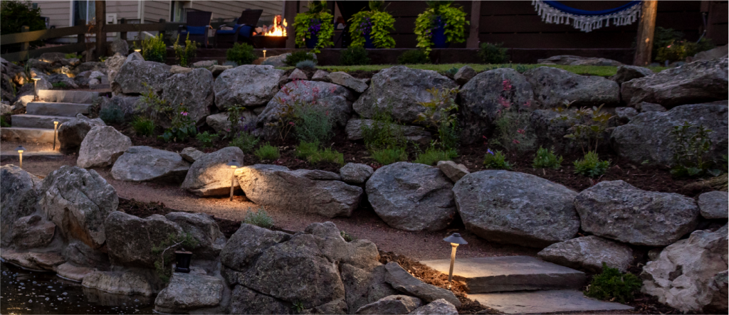 Thoughtfully placed boulders form tiered retaining walls that define the terrain without interrupting it