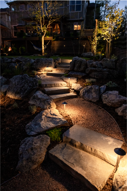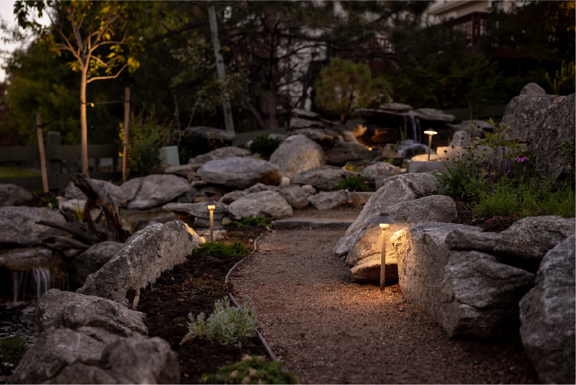 Gravel and stone walkways that wind naturally through the space, subtly guided by integrated landscape lighting.