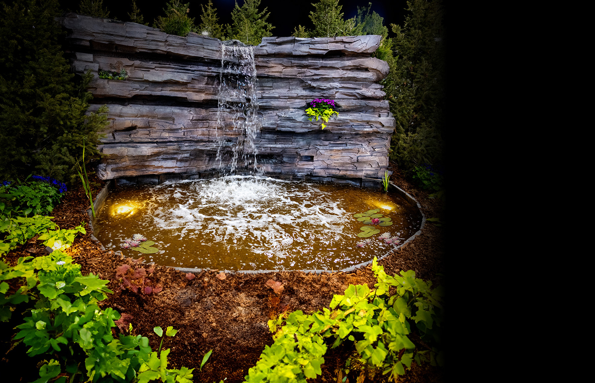 Cascading waterfalls are likley what you’re imagining when you think of having a waterfall in your backyard. Although cascading waterfalls can be pondless, the water usually cascades down multiple layers of rock and ends up in a pond or reservoir below. These beautiful, intricate works of art reflect their natural surroundings and instantly become a magical centerpiece for any outdoor living space. Add some well-placeds lighting to really elevate the ambience at night.